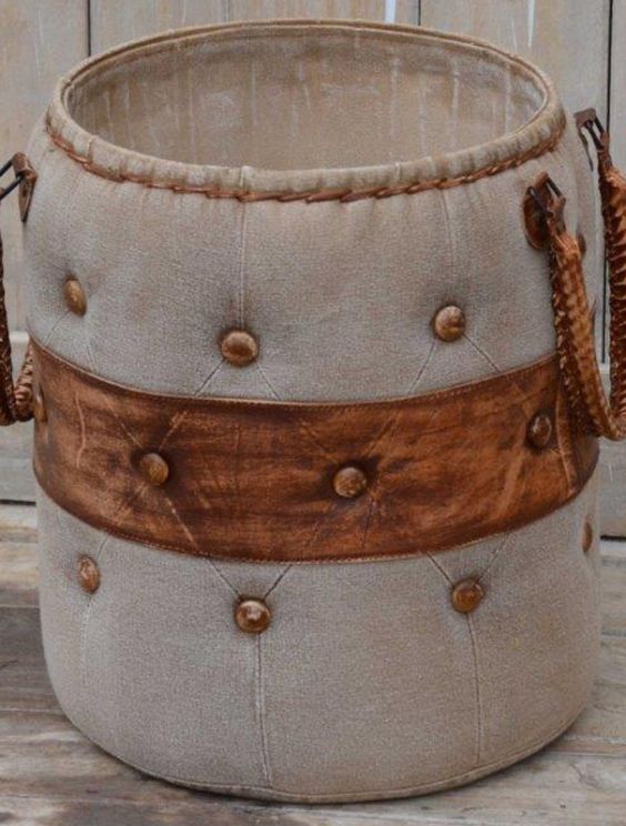 Χρηστικό καλάθι από ύφασμα καπιτονέ με δερμάτινες λεπτομέρειες και χερούλια . Το εσωτερικό του είναι από σκληρό υλικό με επένδυση υφάσματος .