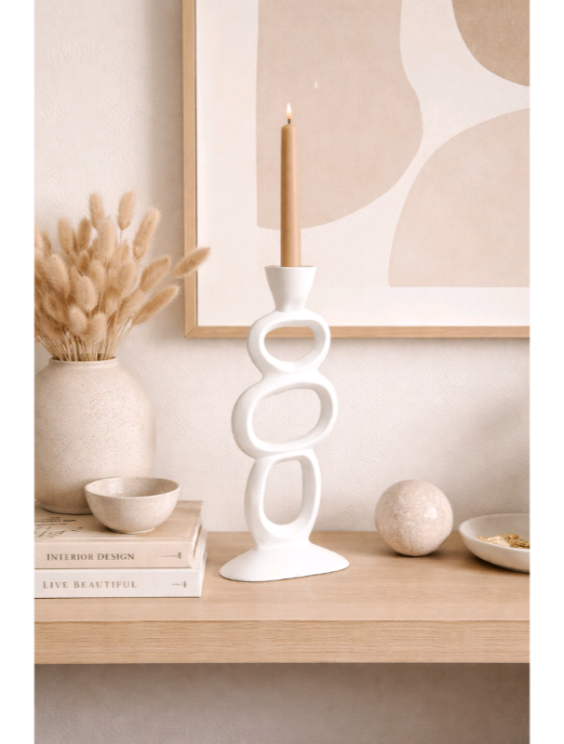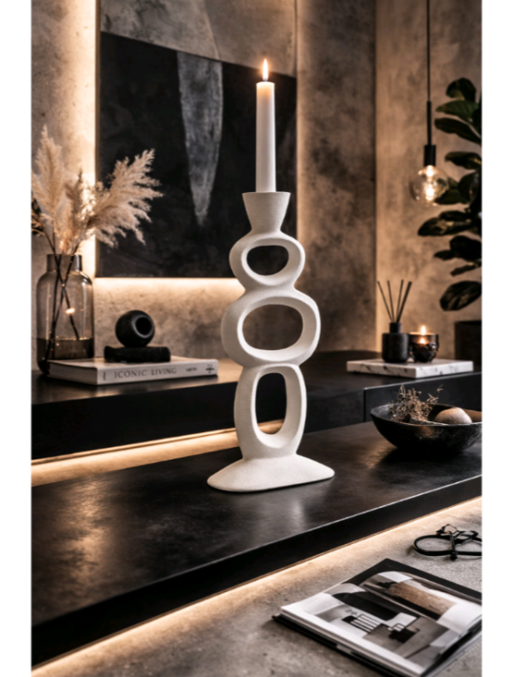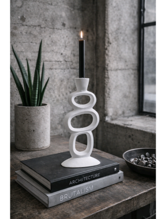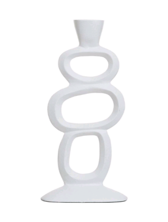 Ένα διακοσμητικό αντικείμενο που ισορροπεί ανάμεσα στη γλυπτική και τη λειτουργικότητα. Το λευκό κηροπήγιο ξεχωρίζει για τη σύνθεσή του από διαδοχικά οργανικά ανοίγματα που δημιουργούν ένα ανάλαφρο αλλά δυναμικό αποτέλεσμα.