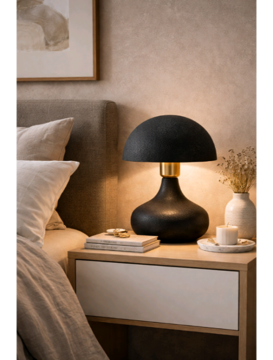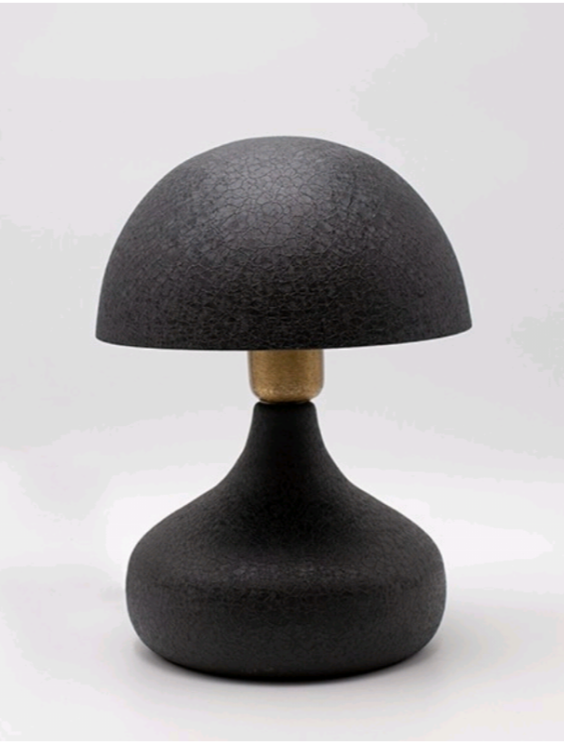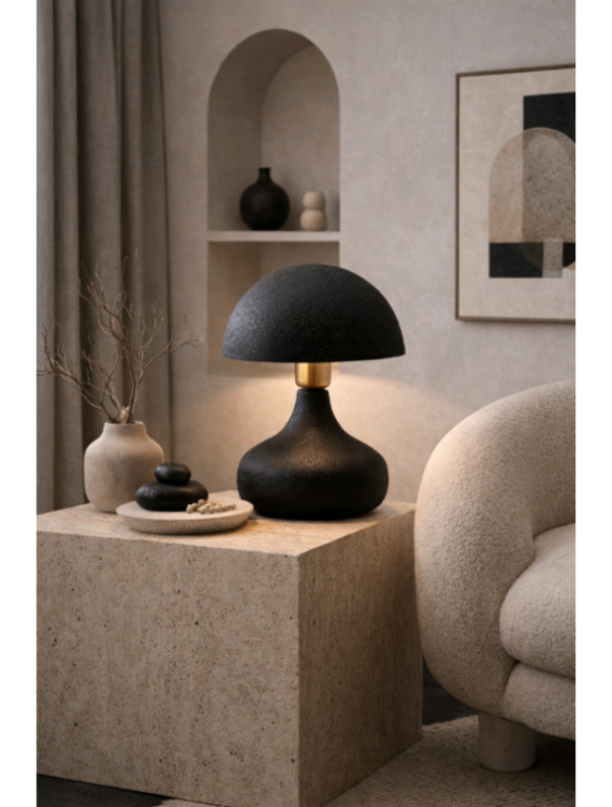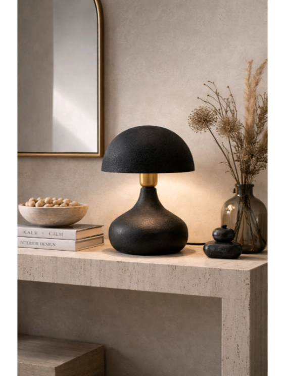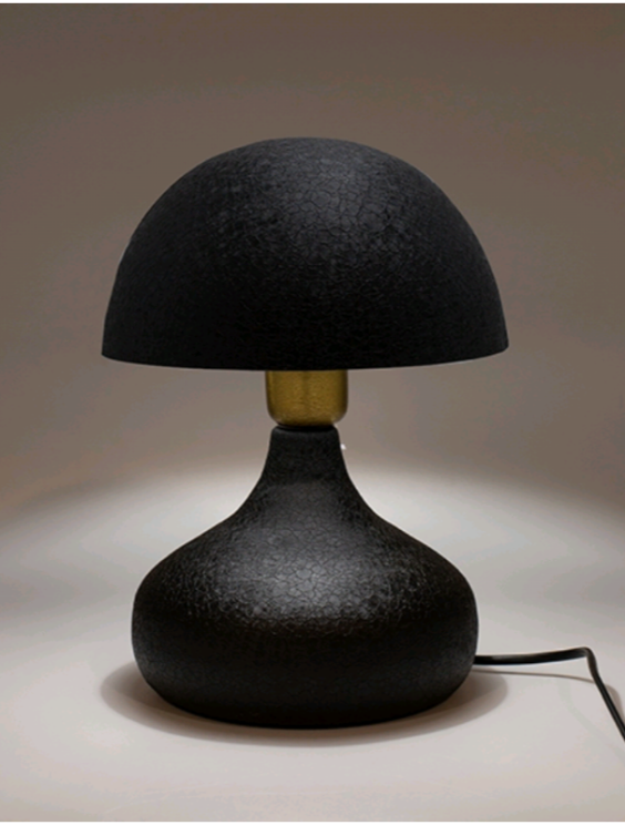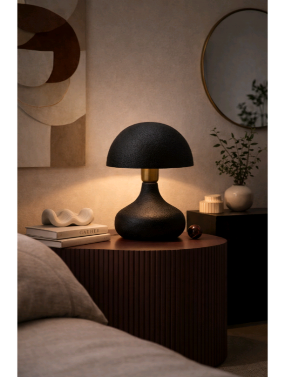 Αυτό το ιδιαίτερο επιτραπέζιο φωτιστικό ξεχωρίζει για τον οργανικό του σχεδιασμό σε σχήμα μανιταριού, προσφέροντας μια μοντέρνα αλλά και διαχρονική πινελιά σε κάθε δωμάτιο .Η βάση και το καπέλο του είναι κατασκευασμένα από μεταλλικό υλικό υψηλής ποιότητας ,διακοσμημένα με μια μοναδική ανάγλυφη υφή (textured finish) σε βαθύ μαύρο χρώμα. Η επιφάνειά του θυμίζει παλαιωμένο δέρμα ,προσθέτοντας βάθος και έναν αέρα εκλέπτυνσης που τραβάει τα βλέμματα ακόμη και όταν η λάμπα είναι σβηστή.