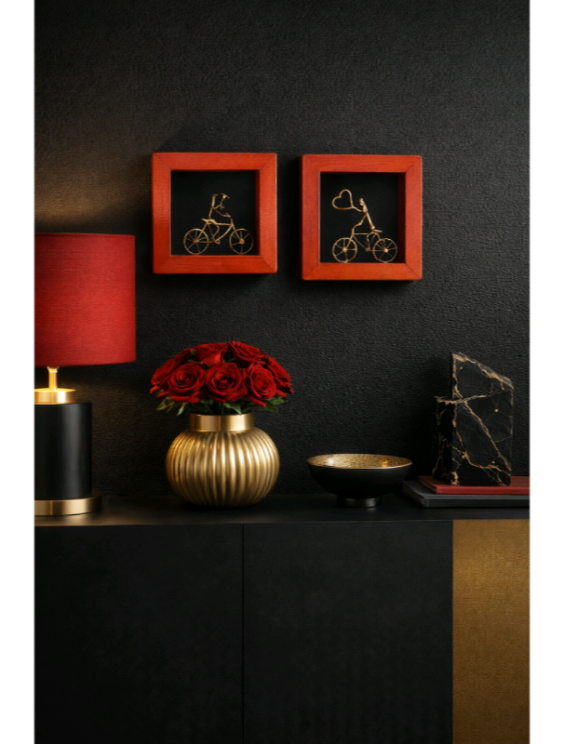Διακοσμητικό καδράκι με κόκκινη ξύλινη κορνίζα και χειροποίητο ορειχάλκινο γλυπτό.